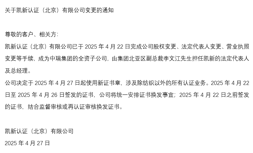 2025.09.05綠色賦能,智鏈全球——?jiǎng)P新認(rèn)證亮相2025 Intertextile秋冬展,共繪紡織可持續(xù)新圖景2025年9月2至4日,中國國際紡織面料及輔料(秋冬)博覽會(huì)(以下簡稱:2025 Intertextile秋冬面輔料展)在國家會(huì)展中心(上海)成功舉辦。2025.09.02凱新認(rèn)證紡織認(rèn)證部赴Cotecna集團(tuán)北亞區(qū)&中國區(qū)總部參加培訓(xùn),專業(yè)能力再上新臺(tái)階近日,我司紡織認(rèn)證部審核員團(tuán)隊(duì)赴Cotecna集團(tuán)北亞區(qū)&中國區(qū)總部參加了由資深專家張偉龍主講的培訓(xùn)。此次培訓(xùn)圍繞環(huán)境管理體系等相關(guān)標(biāo)準(zhǔn)、審核要點(diǎn)及行業(yè)實(shí)踐展開,通過理論講解、案例分析和互動(dòng)研討,進(jìn)一步提升了團(tuán)隊(duì)的專業(yè)技術(shù)能力和服務(wù)水平。2025.07.02凱新認(rèn)證(北京)有限公司順利通過ANAB FSSC 22000食品安全體系現(xiàn)場(chǎng)見證評(píng)審凱新認(rèn)證(北京)有限公司(以下簡稱“凱新認(rèn)證”)成功通過美國國家認(rèn)可委員會(huì)(ANAB)對(duì)FSSC 22000食品安全管理體系的現(xiàn)場(chǎng)見證評(píng)審,并以零不符合的卓越表現(xiàn),彰顯其行業(yè)實(shí)力與專業(yè)水準(zhǔn)。2025.04.27關(guān)于凱新認(rèn)證(北京)有限公司變更的通知尊敬的客戶、相關(guān)方: 凱新認(rèn)證(北京)有限公司已于2025年4月22日完成公司股權(quán)變更、法定代表人變更、營業(yè)執(zhí)照變更等手續(xù),成為中瑞集團(tuán)的全資子公司,由集團(tuán)北亞區(qū)副總裁李文江先生擔(dān)任凱新的法定代表人及總經(jīng)理。